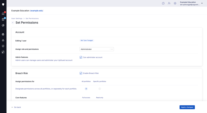 There are three sections to the Set Permissions page: Account, Breach Risk, and Vendor Risk.