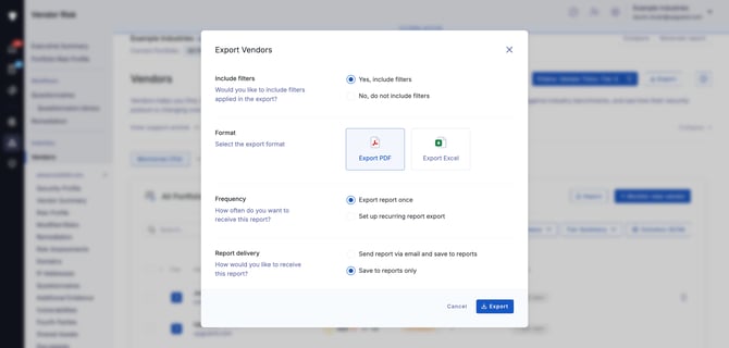 A menu will appear so you can configure your export including the format (PDF or Excel).