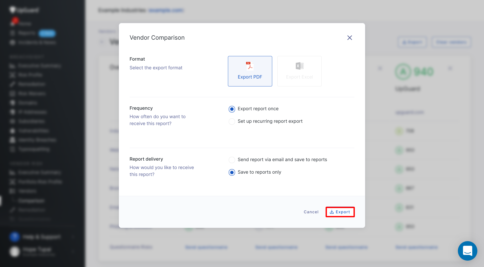 UpGuard's vendor comparison tool lets you compare up to four vendors side-by-side and export the details of the report.
