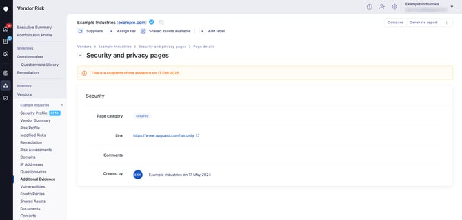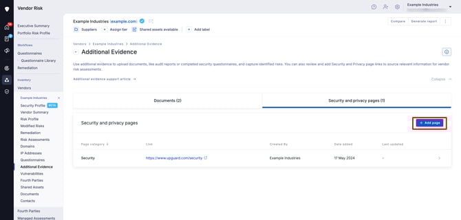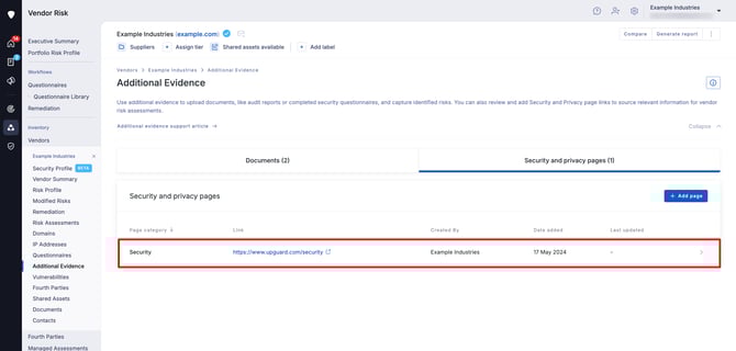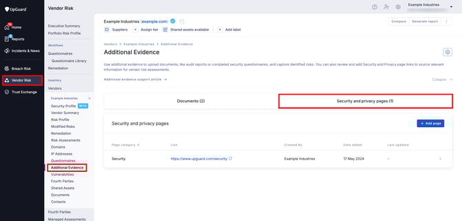 Security and privacy pages for a specific vendor can be found in the Vendors > Select vendor > Vendor summary section or from the Security and privacy pages tab of the Additional evidence section.