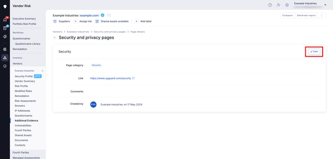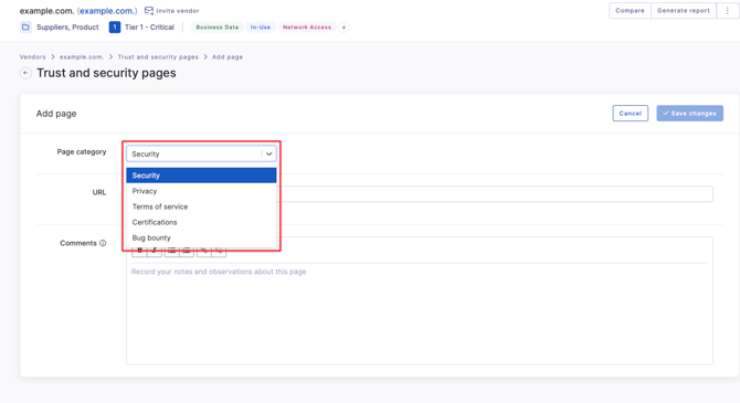 You can add new security and privacy pages for an organization you are monitoring, as well as edit or delete any that have been added by users within your own organization. Pages that have been added by UpGuard or added by users within the vendor organization cannot be deleted or edited.
