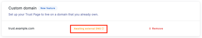 While you’re doing that, the custom domain request will be visible from configure custom domain with the status awaiting external DNS. You can click on this status pill to re-open the record modal at any time, or cancel the custom domain setup using the Remove button.