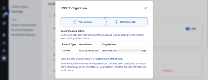 5. Go to your DNS provider and enter the record shown in the modal. The steps to take here will vary depending on your provider.
