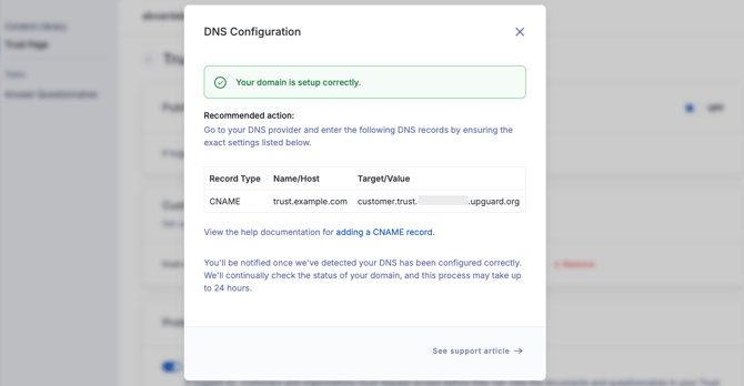 Once you have completed the steps with your DNS provider, we will notify you via email and home page notification that your custom domain has been successfully verified. Return to the Settings screen, where the status will now have been updated to Verified. Open the modal by clicking on the Verified status pill to see the details of your custom domain.