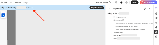 Note the Signatures panel at the top of the document and see how it shows an error for the watermarked document.